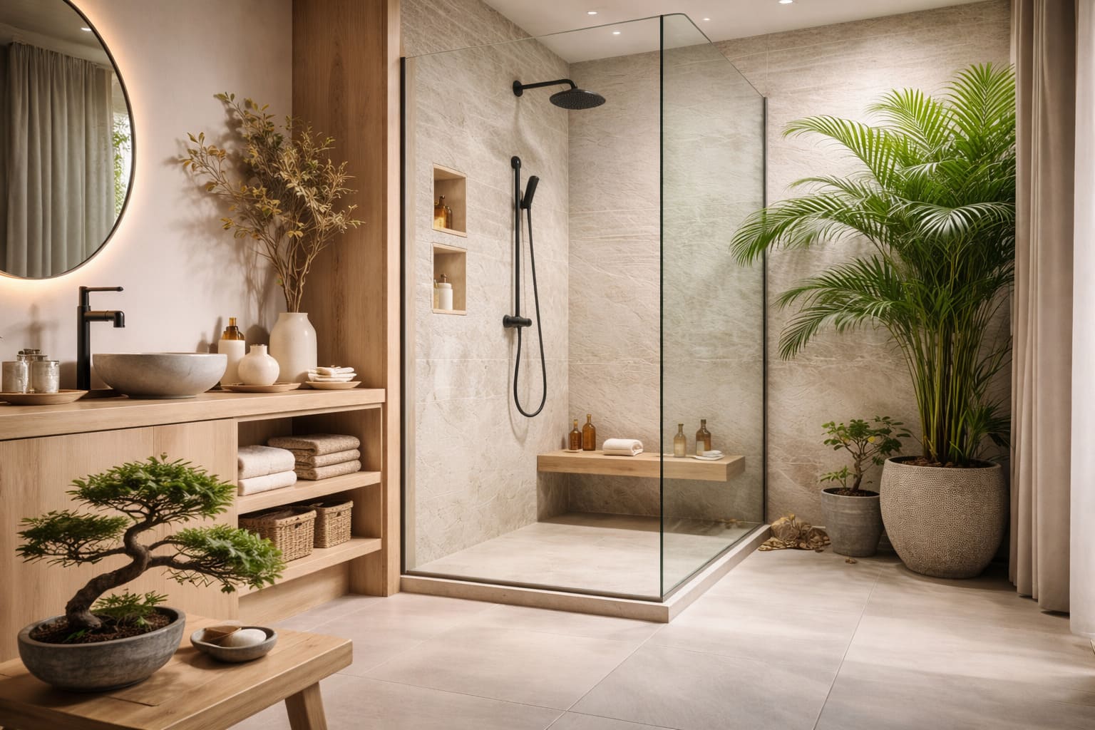 Pour renforcer l’atmosphère apaisante, il est possible d’intégrer une sélection de plantes vertes artificielles réalistes, idéales pour apporter une touche naturelle sans contrainte d’entretien, même dans une pièce humide comme la salle de bain.